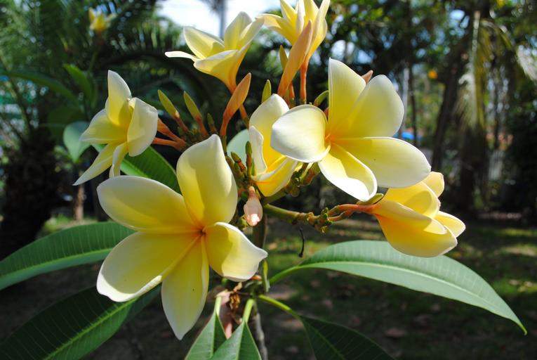 Keywords: frangipani plumeria yellow flower tropical nature blossom bloom plant floral fragrant petal garden spring botanical green tree exotic flowering landscaping
