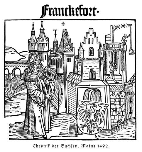 Keywords: Frankfurt Altstadt-1492.gif Blick auf die Frankfurter Altstadt Holzschnitt aus der Chronik der Sachsen erschienen in Mainz 1492 Gescannt vektorisiert Diese die Altstadt vermutlich aus einer südöstlichen Position jenseits des Mains zeigende Holzschnitt aus dem Jahre 1492 ist einer der ältesten bildlichen Darstellungen Frankfurts jedoch in seiner Authentizität nicht unumstritten Die im Bild gezeigte Brücke und die dahinter in die Stadt führende Befestigungsanlage in der Stadtmauer passen bildlich perfekt zu dem Zustand in dem sich wohl die Alte Brücke und das dahinter gelegene Fahrtor zu jener Zeit befanden Auch der Kran auf dem halbfertigen Domturm passt in die historische Realität denn laut historischer Unterlagen wurde dort ab 1490 ein solcher Kran eingesetzt Andererseits sind die in der Stadt gezeigten Häuser nicht zuordenbar - das zentrale Haus sieht wie eine Kreuzung aus Römer und Leinwandhaus aus; eventuell dient dieser Hybrid aber einfach nur der Darstellung der verschiedenen Bautypen auf dem geringen zur Verfügung stehenden Raum Der gezeigte Kirchturm ist auch nur entfernt einer der zu dieser Zeit existierenden Kirchen Frankfurts zuzuordnen am ehesten noch der Nikolaikirche Dies würde aufgrund der Nähe zum Fahrtor dann auch von der örtlichen Zuordnung einleuchten Urheberrechtliche Ansprüche dürften aufgrund des Alters erloschen sein PD-old Frankfurt-Altstadt Stone arch bridges in art Alte Brücke Frankfurt am Main 1492 in Frankfurt am Main |