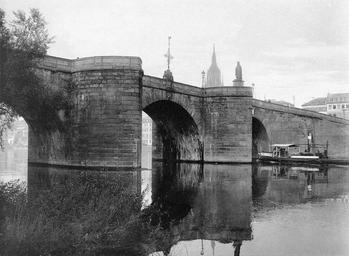Keywords: Frankfurt Am Main-Fay-BADAFAMNDN-Heft 26-Nr 304-1911-Brueckenansicht von Sachsenhausen gesehen.jpg Follows de Heft 26 Tafel 304 / Titel auf der Tafel Brückenansicht von Sachsenhausen gesehen / Originalbeschreibung Zu den Denkmälern der alten Reichsstadt die durch Geschichte und Sage verklärt bestimmt sind für ewige Zeiten im Gedächtnis der Menschen fortzuleben gehört die žrote Mainbrücke Aus Mainsandstein errichtet auf massiven Pfeilern mit kräftigen Vorder- und Hinterköpfen die zwischen dem 5 und 7 Bogen eine architektonisch recht wirksame Ausbuchtung erfahren haben überspannt sie in halbkreisförmigen Bogen aus Quaderschichten den ruhig dahinströmenden Flusslauf Ueber das Alter sind wir nur schlecht unterrichtet Die erste urkundliche Erwähnung der alten Brücke geschieht im Jahre 1222 doch ist mit Sicherheit anzunehmen dass die Erbauung einer Holzbrücke in weit frühere Zeit hinaufreicht Mau kann sich kaum vorstellen dass die ansehnliche Niederlassung um den žSaalhoeff das alte Palatium Ludwigs des Frommen nicht schon sehr bald mit den ausgedehnten Wohnsitzen der Ministerialen in der Sachsenhäuser Gemarkung in direkter Verbindung gestanden hat Allein die Unsolidität des Materials und die rohe Naturgewalt worunter die Menschheit des Mittelalters in ganz anderer Weise zu leiden hatte als wir in unseren Tagen zwangen zu dem kostspieligen Ersatzbau in Stein Doch brachten Mangel an Mittel wie auch die Schwierigkeit geeignete Arbeitskräfte zu finden das monumentale Werk nur langsam voran Man fundierte die Pfeiler unmittelbar mit Hülfe von eichenen Schwellenrosten auf die Flusssohle die nicht etwa wie irrtümlich angenommen wird aus Tonschiefer sondern aus blauem Cyrenenmergel besteht der bei der verstärkten Strömung zwischen den Pfeilern den wachsenden Auskalkungen der Sohle nicht genügenden Widerstand entgegensetzt So wird denn im Laufe des 13 und 14 Jahrhunderts wiederholt von ausgeführten Steinarbeiten an Pfeilern und Schwibbogen berichtet Auch für König Heinrich den Sohn Friedrichs II bildete die Erhaltung der Brücke im Interesse des Reiches einen Gegenstand schwerer Sorge Der aus politischen Gründen vor allem den Städten wohlgesinnte junge Fürst verlieh im Jahre 1235 ein Privilegium zur halben Nutzung der Münze und zum Bezug des zur Reparatur der Brücke nötigen Holzes aus dem Reichswalde Auf das höchste bedroht muss aber die Erhaltung der Brücke um das Jahr 1300 gewesen sein Anders hat es keinen Sinn dass fünfzehn italienische Bischöfe einen Ablass für jene Gläubigen gewähren die zum Bau der vom Hochwasser zerstörten Pfeiler beitrugen Die Brückenbahn bestand zu jener Zeit zum grössten Teil aus Holz und gab dem Bauwerk noch nicht durch die eigene Schwere der gewaltigen Schwibbogen eine Stabilität die allen Unbilden der Witterung bis zum heutigen Tage getrotzt und entgegen den gemachten Einwänden auch für absehbare Zukunft noch trotzen würde Immerhin mag die Brücke im Jahre 1405 wie die Abbildung von dem Schreiber eines Bedebuches zeigt das heutige Aussehen gehabt haben Wenn dennoch aus dem Jahre 1419 berichtet wird dass man an dem letzten Pfeiler gearbeitet habe damit mam fernerhin ždes kostlichen buwes mit holczwercken nit bedarff sondern balken druber leget und druff brückendele so handelt es sich hier um die Beseitigung eines Zustandes den man im Hinblick auf unruhige Zeiten belassen hatte um gegebenen Falles ohne weitere Schwierigkeiten die Verbindung der beiden Flussufer aufzuheben Einen gewissen Schutz gewährte immer noch der über zwei Oeffnungen belassene Brückenbelag aus Bohlen der erst Ende des 16 Jahrhunderts durch Bogen am Sandstein ersetzt wurde Und böse Zeiten zogen für das ehrwürdige Denkmal herauf Im Jahre 1427 sah sich der Rat der freien Reichsstadt genötigt aus Furcht vor den wilden Horden der Hussiten die Bogen der Brücke mit schweren Balken versperren zu lassen Den Einspruch des in seinen Fluss- und Hoheitsrechten sich beschränkt glaubenden Erzbischhofs von Mainz nahm man leicht Etwa 100 Jahre später aber während der Bewegung des Bauernaufstandes der auch in das Maintal hinüber gegriffen hatte pflanzte die ärmere Bevölkerung der Stadt die Fahne der Empörung auf der Brücke auf ohne dass es jedoch zu ernsthafteren Zusammenstössen gekommen war Schlimmer erging es dem Bauwerk im schmalkaldischen Kriege Als das Protestantenheer zur Belagerung der damals in kaiserlichem Besitz sich befindenden Reichsstadt schritt hatte man alle Vorkehrungen zum Schutze des unentbehrlichen Verkehrsweges getroffen Grosse Leinentücher waren auf der Brücke gespannt und die Mühle selbst mit grossen Wollsäcken verstopft um sie während der Zeit der Bedrängnisse in Gang zu halten Der Hauptanschlag zur Zerstörung der Brücke vermittels schweren Geschützes vereitelte der Abschluss des Passauer Vertrages und der damit verbundene Abzug eines Teiles der Belagerungstruppen Kaum weniger ernst war die Lage der Brücke im dreissigjährigen Kriege Auf der Fahrbahn selbst kam es zu heftigem Kampfe und es muss als ein Wunder angesehen werden dass bei dem Geschützfeuer von Ufer zu Ufer wobei 26 Häuser in Asche gelegt wurden die Brücke selbst kaum wesentlichen Schaden erlitt Allein an dem Kruzifix seien wie die Ueberlieferung will noch heute die Spuren von Schwedenkugeln sichtbar Im siebenjährigen Kriege wie im Befreiungskriege hat ein günstiger Stern über der Stadt gewaltet und grössere Verluste ferngehalten Im Sturmjahre 1848 sah die Brücke die letzten kriegerischen Ereignisse die aber Spuren irgendwelcher Art an dem Denkmal nicht hinterlassen haben <br>Wie in Kriegszeiten so stand auch in den Jahren des Friedens die alte Mainbrücke im Mittelpunkt des Interessens der Bewohner Ein gewaltiger Menschenstrom zog jahraus jahrein auf uralten Handelswegen über die Brücke die zur Lebensader des Rhein- und Main-Gaues geworden war Durch besondere Gesetze geschützt bedrohte man einen jeden der auf der Brücke Streit anfing mit 