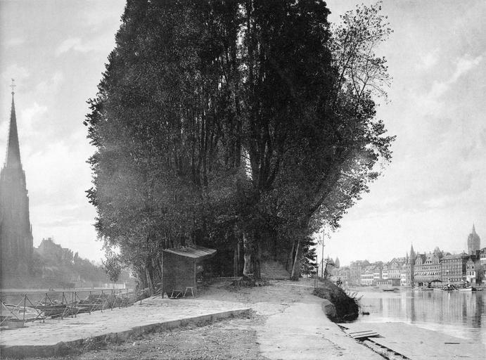 Keywords: Frankfurt Am Main-Fay-BADAFAMNDN-Heft 26-Nr 311-1911-Maininsel von der Inseltreppe gesehen.jpg Follows de Heft 26 Tafel 311 / Titel auf der Tafel Maininsel von der Inseltreppe gesehen / Originalbeschreibung Zu den Denkmälern der alten Reichsstadt die durch Geschichte und Sage verklärt bestimmt sind für ewige Zeiten im Gedächtnis der Menschen fortzuleben gehört die žrote Mainbrücke Aus Mainsandstein errichtet auf massiven Pfeilern mit kräftigen Vorder- und Hinterköpfen die zwischen dem 5 und 7 Bogen eine architektonisch recht wirksame Ausbuchtung erfahren haben überspannt sie in halbkreisförmigen Bogen aus Quaderschichten den ruhig dahinströmenden Flusslauf Ueber das Alter sind wir nur schlecht unterrichtet Die erste urkundliche Erwähnung der alten Brücke geschieht im Jahre 1222 doch ist mit Sicherheit anzunehmen dass die Erbauung einer Holzbrücke in weit frühere Zeit hinaufreicht Mau kann sich kaum vorstellen dass die ansehnliche Niederlassung um den žSaalhoeff das alte Palatium Ludwigs des Frommen nicht schon sehr bald mit den ausgedehnten Wohnsitzen der Ministerialen in der Sachsenhäuser Gemarkung in direkter Verbindung gestanden hat Allein die Unsolidität des Materials und die rohe Naturgewalt worunter die Menschheit des Mittelalters in ganz anderer Weise zu leiden hatte als wir in unseren Tagen zwangen zu dem kostspieligen Ersatzbau in Stein Doch brachten Mangel an Mittel wie auch die Schwierigkeit geeignete Arbeitskräfte zu finden das monumentale Werk nur langsam voran Man fundierte die Pfeiler unmittelbar mit Hülfe von eichenen Schwellenrosten auf die Flusssohle die nicht etwa wie irrtümlich angenommen wird aus Tonschiefer sondern aus blauem Cyrenenmergel besteht der bei der verstärkten Strömung zwischen den Pfeilern den wachsenden Auskalkungen der Sohle nicht genügenden Widerstand entgegensetzt So wird denn im Laufe des 13 und 14 Jahrhunderts wiederholt von ausgeführten Steinarbeiten an Pfeilern und Schwibbogen berichtet Auch für König Heinrich den Sohn Friedrichs II bildete die Erhaltung der Brücke im Interesse des Reiches einen Gegenstand schwerer Sorge Der aus politischen Gründen vor allem den Städten wohlgesinnte junge Fürst verlieh im Jahre 1235 ein Privilegium zur halben Nutzung der Münze und zum Bezug des zur Reparatur der Brücke nötigen Holzes aus dem Reichswalde Auf das höchste bedroht muss aber die Erhaltung der Brücke um das Jahr 1300 gewesen sein Anders hat es keinen Sinn dass fünfzehn italienische Bischöfe einen Ablass für jene Gläubigen gewähren die zum Bau der vom Hochwasser zerstörten Pfeiler beitrugen Die Brückenbahn bestand zu jener Zeit zum grössten Teil aus Holz und gab dem Bauwerk noch nicht durch die eigene Schwere der gewaltigen Schwibbogen eine Stabilität die allen Unbilden der Witterung bis zum heutigen Tage getrotzt und entgegen den gemachten Einwänden auch für absehbare Zukunft noch trotzen würde Immerhin mag die Brücke im Jahre 1405 wie die Abbildung von dem Schreiber eines Bedebuches zeigt das heutige Aussehen gehabt haben Wenn dennoch aus dem Jahre 1419 berichtet wird dass man an dem letzten Pfeiler gearbeitet habe damit mam fernerhin ždes kostlichen buwes mit holczwercken nit bedarff sondern balken druber leget und druff brückendele so handelt es sich hier um die Beseitigung eines Zustandes den man im Hinblick auf unruhige Zeiten belassen hatte um gegebenen Falles ohne weitere Schwierigkeiten die Verbindung der beiden Flussufer aufzuheben Einen gewissen Schutz gewährte immer noch der über zwei Oeffnungen belassene Brückenbelag aus Bohlen der erst Ende des 16 Jahrhunderts durch Bogen am Sandstein ersetzt wurde Und böse Zeiten zogen für das ehrwürdige Denkmal herauf Im Jahre 1427 sah sich der Rat der freien Reichsstadt genötigt aus Furcht vor den wilden Horden der Hussiten die Bogen der Brücke mit schweren Balken versperren zu lassen Den Einspruch des in seinen Fluss- und Hoheitsrechten sich beschränkt glaubenden Erzbischhofs von Mainz nahm man leicht Etwa 100 Jahre später aber während der Bewegung des Bauernaufstandes der auch in das Maintal hinüber gegriffen hatte pflanzte die ärmere Bevölkerung der Stadt die Fahne der Empörung auf der Brücke auf ohne dass es jedoch zu ernsthafteren Zusammenstössen gekommen war Schlimmer erging es dem Bauwerk im schmalkaldischen Kriege Als das Protestantenheer zur Belagerung der damals in kaiserlichem Besitz sich befindenden Reichsstadt schritt hatte man alle Vorkehrungen zum Schutze des unentbehrlichen Verkehrsweges getroffen Grosse Leinentücher waren auf der Brücke gespannt und die Mühle selbst mit grossen Wollsäcken verstopft um sie während der Zeit der Bedrängnisse in Gang zu halten Der Hauptanschlag zur Zerstörung der Brücke vermittels schweren Geschützes vereitelte der Abschluss des Passauer Vertrages und der damit verbundene Abzug eines Teiles der Belagerungstruppen Kaum weniger ernst war die Lage der Brücke im dreissigjährigen Kriege Auf der Fahrbahn selbst kam es zu heftigem Kampfe und es muss als ein Wunder angesehen werden dass bei dem Geschützfeuer von Ufer zu Ufer wobei 26 Häuser in Asche gelegt wurden die Brücke selbst kaum wesentlichen Schaden erlitt Allein an dem Kruzifix seien wie die Ueberlieferung will noch heute die Spuren von Schwedenkugeln sichtbar Im siebenjährigen Kriege wie im Befreiungskriege hat ein günstiger Stern über der Stadt gewaltet und grössere Verluste ferngehalten Im Sturmjahre 1848 sah die Brücke die letzten kriegerischen Ereignisse die aber Spuren irgendwelcher Art an dem Denkmal nicht hinterlassen haben <br>Wie in Kriegszeiten so stand auch in den Jahren des Friedens die alte Mainbrücke im Mittelpunkt des Interessens der Bewohner Ein gewaltiger Menschenstrom zog jahraus jahrein auf uralten Handelswegen über die Brücke die zur Lebensader des Rhein- und Main-Gaues geworden war Durch besondere Gesetze geschützt bedrohte man einen jeden der auf der Brücke Streit anfing mit dem Abha