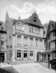 Keywords: Frankfurt Am Main-Fay-BADAFAMNDN-Heft 04-Nr 040-1897-Friedrich Stoltze s Geburtshaus.jpg Artwork Creator Carl Friedrich Fay 40 Friedrich Stoltze's house of birth Der früher geschlossene Hof zum Rebstock zwischen Markt und Schnurgasse gehörte im 14 Jahrhundert dem vornehmen Geschlecht der Weissen von Limburg Von diesem ging er noch vor Erlöschen dieses Geschlechts an einen Junker Justinian Rauscher in Besitz über 1544 Nach diesem kam er an Ulrich von Rauscher der sich 1543 mit Elisabeth von Hell genannt Pfeffer verehelicht hatte und dadurch in der adlichen Gesselschaft vom Hause Limburg Aufnahme fand Die Wappen der Eheleute waren an dem Thorbogen der Kruggasse angebracht worden Später wurde der Hof Eigenthum verschiedener nichtadlicher Personen Die drei Ausgänge nach dem Markt der Neugasse und der Kruggasse sind seit langer Zeit nicht mehr geschlossen In diesem ehemaligen Hofe befindet sich das auf Blatt No 40 wiedergegebene Geburtshaus des beliebten Volksdichters Friedrich Stoltze Das Haus war 1632 Gasthaus und führte den Namen žZum Rebstock Stoltze's Vater geb am 21 März 1783 zu Hörla in Waldeck war früher Oberkellner im žweissen Schwan hatte sich vermählt mit Anna Maria Rottmann Tochter des wohlhabenden Wirthes žZur goldenen Spitz welches Haus hinten an den Rebstock mit Ausgang nach dem Mausgässchen stiess Der Vater Christian Stoltze der das Haus käuflich erwarb betrieb dort die Gastwirthschaft und einen Mineralwasserhandel und bekleidete auch die Hauptmannscharge im Löschbataillon Hier verkehrten anfangs der 1830er Jahren die Frankfurter Liberalen darunter Funck Sauerwein und Freyeisen ebenso war bei dem Durchzug der Polen der Rebstock der Sammelort derselben und Stoltze's Schwester Anna war nach dem Frankfurter Aufstand 1833 zur Untersuchung resp zur Vernehmung gefordert worden wie in Stoltze's Gedichten mehrfach berührt ist Stoltze's Vater starb am 21 November 1837 die Mutter am 24 Dezember 1868 Friedrich Stoltze war am 21 November 1816 geboren und starb am 28 März 1891 Am 70 Geburtstag des Dichters 1886 wurde das Geburtshaus mit einer Gedenktafel mit der Umschrift žDer Bezirksverein Altfrankfurt errichtete diese Tafel am 70 Geburtstag des Dichters geschmückt de um 1897 technique collotype dry plate size cm 21 04 16 31 unknown Private collection Mylius Frankfurt am Main object history credit line Cropped to borders fully manually retouched version Bis an die Ränder beschnittene vollständige manuelle retuschierte Fassung accession number Carl Friedrich Fay Carl Friedrich Mylius Franz Rittweger Fritz Rupp Bilder aus dem alten Frankfurt am Main Nach der Natur Verlag von Carl Friedrich Fay Frankfurt am Main 1896 “1911 PD-old Bilder aus dem alten Frankfurt am Main Nach der Natur Hof Rebstock am Markt Friedrich Stoltze 1897 in Frankfurt am Main 1897 |