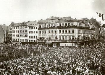 Keywords: Frankfurt Goetheplatz 1895.jpg Frankfurt am Main Germany Der Goetheplatz mit dem Hotel zum Schwan rechts der Steinweg <br> Das Bild zeigt die 25-jährige Jubiläumsfeier des Sedantags am 2 September 1895 Urheberrechte aufgrund des Alters erloschen Photograph Friedrich Lauffer 1868-1940 Quelle Stadtarchiv Frankfurt PD-old Sedantag Frankfurt-Innenstadt 1894 in Frankfurt am Main 1895 Hotel zum Schwan |