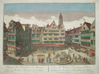 Keywords: Frankfurt Guckkastenbild Markt Römer.jpg Frankfurt am Main Guckkastenbild des Hühnermarkts am alten Markt žProspect des Marckts zu Franckfurt am Mayn Motivmaß 41 2 cm x 27 4 cm ebay de ca 1770 Balthasar Probst PD-old Peep show cards Balthasar Probst Hühnermarkt Frankfurt Markt Frankfurt am Main Border is intentional |