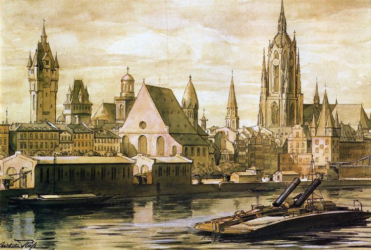 Keywords: Frankfurt Mainkuh.jpg en Frankfurt on the Main Tugboat žMaakuh coll for žMain Cow of the Mainkette-AG Main Chain Stock Corporation in front of the Mainkai Main Quay on its line between Mainz and Aschaffenburg founded in 1886 in the background from left to right the towers Langer Franz Tall Franz Kleiner Cohn Short Cohn the Paulskirche Saint Paul's Church the Leonhardskirche Saint Leonhard's Church the ridge turret of the Römer the tower of the Alte Nikolaikirche Old Saint Nicholas Church and of the Cathedral followed by the ridge turret atop its crossing and finally the Rententurm Pension Tower de Frankfurt am Main Kettenschleppschiff žMaakuh ugs für žMainkuh der Mainkette-AG vor dem Mainkai auf der 1886 begründeten Linie zwischen Mainz und Aschaffenburg im Hintergrund von links nach rechts die Türme Langer Franz Kleiner Cohn der Paulskirche der Leonhardskirche der Dachreiter des Römers der Turm der Alten Nikolaikirche und des Doms gefolgt von dessen Dachreiter auf der Vierung sowie schließlich der Rententurm Wolfgang Klötzer Wissenschaftlicher Leiter Frankfurt-Archiv Archiv-Verlag Braunschweig Braunschweig 1982 “88 en between 1904 and 1911 probably shortly after 1908 de zwischen 1904 und 1911 wahrscheinlich kurz nach 1908 Wilhelm Reiss PD-Art Main in Frankfurt am Main 1909 in Frankfurt am Main 1886 Frankfurt-Altstadt Chain ships |