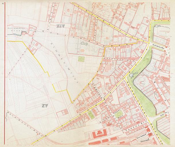 Keywords: Frankfurt-Ravenstein1861-Bl4.jpg Ravenstein à bersicht Die neun Kartenblätter des vorgenannten Plans erschienen 1862 im Verlag des Geographischen Instituts zu Frankfurt am Main und sind der letzte große Plan der die Stadt noch völlig unberührt von den neuzeitlichen Straßendurchbrüchen darstellt; ausgenommen der Spindler-Plan von 1866 der jedoch nur fragmentarisch überliefert und somit unbrauchbar ist Was seinerzeit an Ravensteins Plan bemerkenswert war ist zum einen die Maßstabstreue die auf Grunlage eines mathematisch durchgerechneten Koordinatensystems erzielt wurde zum anderen die enorme Genauigkeit zeigt er doch jede einzelne Parzelle mit Hausnummer und benennt auch selbst kleinste Seitengassen Umso bemerkenswerter ist diese Leistung wenn man berücksichtigt dass der Plan noch größtenteils in Handarbeit und ohne moderne technische Hilfsmittel entstand Die Herstellung im chromolithograpischen Steindruckverfahren begründet zudem eine graphische Qualität die viele modernere Verfahren nie wieder erreicht haben Noch einige Worte zur Digitalisierung die heute bereits über 140 Jahre alten Pläne befanden sich zum Zeitpunkt der Digitalisierung August 2006 in einem bedauernswerten Zustand Die zeitgenössische Unsitte auf nicht säurefreiem Papier zu drucken hatte alle Blätter stark vergilben lassen eine unangemessene Lagerung der Pläne vermutlich während Kriegszeiten zu deren Schutz liess Feuchtigkeit in das Papier einziehen was wiederum zu Schimmelbildung in Form von teils starker Stockfleckigkeit führte Außerhalb industrieller Anwendungen fand sich weiter keine bezahlbare Möglichkeit der direkten Digitalsierung der etwas unter A2 großen Blätter Daher wurden diese jeweils in zwei Stücken mit einem A3-Scanner bei 600 DPI gescannt und anschließend mit einer für Fotopanoramen gedachten Software wieder zusammengefügt Anschließend erfolgten händische Retuschen aller Blätter ein digitales Entrauschen der sich aufgrund der hohen Auflösung zeigenden Papierstruktur und eine anschließende Farbkorrektur die einen Großteil der durch Vergilben verursachten Farbabweichungen beheben konnte Zuletzt wurden von den über 120 Megapixel großen Einzelblättern JPEGs mit 4000 Pixel Höhe gezogen da nur in dieser Auflösung eine Bildgröße um 5 MB gewährleistet ist; dies kann nur als Kompromiss gesehen werden da teilweise selbst bei Vollauflösung feinste Details wie Brunnen oder winzige Treppen in Hinterhöfen kaum erkennbar sind Bei Interesse an verlustlosen Originalen größeren Ausschnitten etc helfe ich http //de wikipedia org/wiki/Benutzer Doenertier82 natürlich jederzeit gerne aus Blatt 4 des Plans Mitte links Urheberrechtliche Ansprüche sind aufgrund des Alters erloschen PD-old August Ravensteins Geometrischer Plan von Frankfurt am Main B1 |