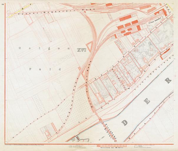Keywords: Frankfurt-Ravenstein1861-Bl7.jpg Ravenstein à bersicht Die neun Kartenblätter des vorgenannten Plans erschienen 1862 im Verlag des Geographischen Instituts zu Frankfurt am Main und sind der letzte große Plan der die Stadt noch völlig unberührt von den neuzeitlichen Straßendurchbrüchen darstellt; ausgenommen der Spindler-Plan von 1866 der jedoch nur fragmentarisch überliefert und somit unbrauchbar ist Was seinerzeit an Ravensteins Plan bemerkenswert war ist zum einen die Maßstabstreue die auf Grunlage eines mathematisch durchgerechneten Koordinatensystems erzielt wurde zum anderen die enorme Genauigkeit zeigt er doch jede einzelne Parzelle mit Hausnummer und benennt auch selbst kleinste Seitengassen Umso bemerkenswerter ist diese Leistung wenn man berücksichtigt dass der Plan noch größtenteils in Handarbeit und ohne moderne technische Hilfsmittel entstand Die Herstellung im chromolithograpischen Steindruckverfahren begründet zudem eine graphische Qualität die viele modernere Verfahren nie wieder erreicht haben Noch einige Worte zur Digitalisierung die heute bereits über 140 Jahre alten Pläne befanden sich zum Zeitpunkt der Digitalisierung August 2006 in einem bedauernswerten Zustand Die zeitgenössische Unsitte auf nicht säurefreiem Papier zu drucken hatte alle Blätter stark vergilben lassen eine unangemessene Lagerung der Pläne vermutlich während Kriegszeiten zu deren Schutz liess Feuchtigkeit in das Papier einziehen was wiederum zu Schimmelbildung in Form von teils starker Stockfleckigkeit führte Außerhalb industrieller Anwendungen fand sich weiter keine bezahlbare Möglichkeit der direkten Digitalsierung der etwas unter A2 großen Blätter Daher wurden diese jeweils in zwei Stücken mit einem A3-Scanner bei 600 DPI gescannt und anschließend mit einer für Fotopanoramen gedachten Software wieder zusammengefügt Anschließend erfolgten händische Retuschen aller Blätter ein digitales Entrauschen der sich aufgrund der hohen Auflösung zeigenden Papierstruktur und eine anschließende Farbkorrektur die einen Großteil der durch Vergilben verursachten Farbabweichungen beheben konnte Zuletzt wurden von den über 120 Megapixel großen Einzelblättern JPEGs mit 4000 Pixel Höhe gezogen da nur in dieser Auflösung eine Bildgröße um 5 MB gewährleistet ist; dies kann nur als Kompromiss gesehen werden da teilweise selbst bei Vollauflösung feinste Details wie Brunnen oder winzige Treppen in Hinterhöfen kaum erkennbar sind Bei Interesse an verlustlosen Originalen größeren Ausschnitten etc helfe ich http //de wikipedia org/wiki/Benutzer Doenertier82 natürlich jederzeit gerne aus Blatt 7 des Plans unten links Urheberrechtliche Ansprüche sind aufgrund des Alters erloschen PD-old August Ravensteins Geometrischer Plan von Frankfurt am Main C1 |