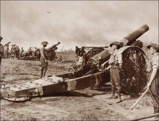 Keywords: FrankHurleyAustralian8inchHowitzerBattery.jpg Photograph of a battery of 8 inch Howitzers of Australian 54th Siege Artillery Battery Western Front 1917 <br>The gun is mounted on the Vickers firing platform with the traversing rail visible beneath the end of the trail Australian Commonwealth Government August 1917 - August 1918 First exhibited at the Kodak Salon Sydney 1919 Frank Hurley PD-AustraliaGov BL 8 inch Howitzer Mk VI - VIII World War I forces of Australia World War I Photographs by Frank Hurley |
