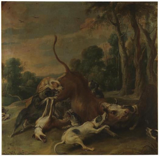 Keywords: Frans Snyders - A bull overpowered by dogs.jpg Artwork Creator Frans Snyders between 1620 1657 Oil canvas size cm 98 100 Institution Prado object history credit line accession number https //www museodelprado es/coleccion/obra-de-arte/toro-rendido-por-perros/4cf0a061-339c-439a-a728-ff32b578677e Prado PD-old-100 Hunting scenes by Frans Snyders Prado Paintings by Frans Snyders in the Prado Museum Hunt 17th-century oil on canvas paintings in Spain Hunting dogs in art Paintings of hunting 17th-century paintings of animals |