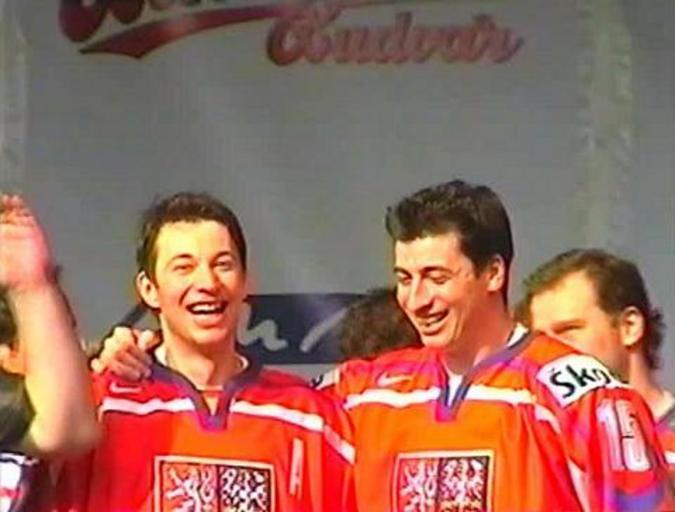 Keywords: František Kaberle and Tomáš Kaberle.JPG Čeští hokejisté František Kaberle vlevo a jeho bratr Tomáš Kaberle Czech ice hockey players František Kaberle left and his brother Tomáš Kaberle own - frame capture from homemade video Jarba 2005-05-15 Tomáš Kaberle Arrival of the Czech national ice hockey team Old Town Square 15 May 2005 František Kaberle |