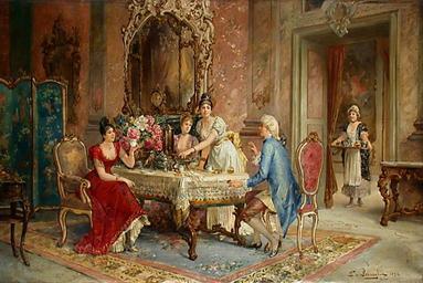 Keywords: Franz von Persoglia Gesellschaft beim Tee.jpg Gesellschaft beim Tee im Salon Wien 1892 place/date Oil on canvas 53 x 79 cm Creator Franz von Persoglia PD-old-100 http //www hampel-auctions com/ Living rooms in art Mirrors in paintings Domestic workers in art Domestic workers in Austria Tea serving Tea drinking in art Franz von Persoglia Images from Hampel Auctions Rococo revival paintings 1892 in Vienna 1892 paintings |