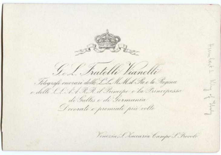 Keywords: Fratelli Vianelli (Giuseppe e Luigi, flor. 1860-1890 ca) - VE - Umberto I di Savoia 2.jpg Retro dell'immagine Fratelli Vianelli Venezia Re Umberto I of Italy con il marchio dell'azienda Back of the picture Fratelli Vianelli Venice King Umberto I di Savoia diplaying the trademark <gallery> File Fratelli Vianelli Giuseppe e Luigi flor 1860-1890 ca - VE - Umberto I di Savoia 1 jpg Recto File Fratelli Vianelli Giuseppe e Luigi flor 1860-1890 ca - VE - Umberto I di Savoia 2 jpg Verso </gallery> scan Forse durante la visita dei Reali a Venezia il 20 luglio 1882 Studio Giuseppe e Luigi Vianelli floruerunt 1860-1890 ca PD-old Fratelli Vianelli Trademark 1882 Umberto I of Italy 1882 1882 Trademarks of early photographers Vianelli 1882 |