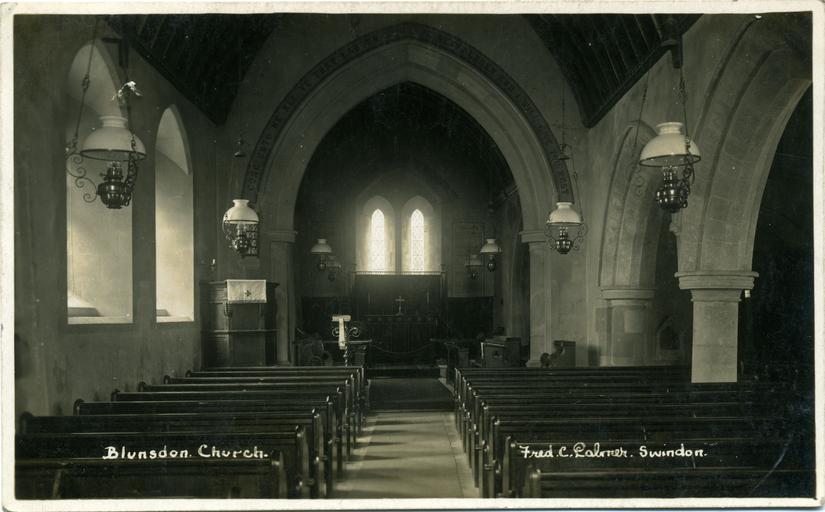 Keywords: Fred C Palmer Blunsdon church interior.jpg 1927 postcard of the interior of Blunsdon church near Swindon Wiltshire looking east toward the chancel On the right is the 13th-century south arcade <br>The photographer is Fred C Palmer of Tower Studio Herne Bay Kent 1905 “19 and of 6 Cromwell Street Swindon circa 1920 “36 He died in 1941 Border The remaining border of this image is important for researchers of this photographer Some photographers trimmed their images more than others and Palmer has a reputation for producing smaller postcards than other early 20th century UK photographers He took his own photos developed them in-house onto postcard-backed photographic paper and trimmed them himself It is worth adding that during hand-developing the border is actively masked with equipment which both crops the picture and causes the white frame or border to appear on the paper This frame is part of the design and is one of the reasons why the quality of Palmer's work is so interesting and why there is an article and category for him on English Wiki Researchers need to see exactly where the edge of the postcard is In the case of this image we don't have the whole border in shot but we can still see that the photographer intended a white border and we can see where he cropped his image All this is part of the artwork Thank you for taking the time to read this Original postcard scanned by uploader Postmarked 1927 Fred C Palmer died 1941 Out of copyright PD-art-70 Arcades in England Black and white photographs of religious buildings Chancels in Wiltshire Fred C Palmer of Swindon Interiors of churches in Wiltshire St Andrew's church Blunsdon DEFAULTSORT Blunsdon |