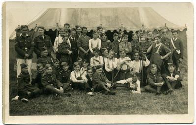 Keywords: Fred C Palmer Boys Brigade 001.jpg Postcard portrait of South London Boys Brigade probably taken at or near Herne Bay Kent England from 1907 to 1922 The group is probably at summer camp The postcard is unused postally The photographer was Fred C Palmer who was working at Tower Studio Herne Bay Kent 1907-1922 who is believed to have died 1936-1939 On the back of the unused card is printed F C Palmer Tower Studio Herne Bay Someone has handwritten in pencil 46 S London BB This print has darkened with age but it would be inappropriate to adjust the brightness because detail would be lost Points of interest A boy at the front is wearing a caliper; he is probably a polio survivor A few boys at the front are wearing puttees The boy with the glass is reflecting popular contemporary music-hall humour Fred C Palmer has done or said something just enough to make the boys smile but so as not to make the group fall apart with laughter; a difficult balance to achieve with young excited kids The boy in uniform who is standing almost in front of the man in waistcoat and watch-chain has London written on his shoulder Two of the adults in charge are discreetly holding cigarettes in their folded hands Border The remaining border of this image is important for researchers of this photographer Some photographers trimmed their images more than others and Palmer has a reputation for producing smaller postcards than other early 20th century UK photographers He took his own photos developed them in-house onto postcard-backed photographic paper and trimmed them himself It is worth adding that during hand-developing the border is actively masked with equipment which both crops the picture and causes the white frame or border to appear on the paper This frame is part of the design and is one of the reasons why the quality of Palmer's work is so interesting and why there is an article and category for him on English Wiki Researchers need to see exactly where the edge of the postcard is The darker part of the white frame on the left is of interest as it gives a clue to the development process and the equipment used Thank you for taking the time to read this Scan of original postcard in my possession 1907-1922 Fred C Palmer died 1936-1939 out of copyright PD-old-70-1923 Fred C Palmer of Herne Bay Herne Bay Kent Black and white photographs of boys Boys' Brigade |