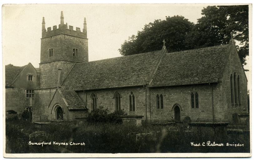 Keywords: Fred C Palmer Somerford Keynes church.jpg Postcard of the Church of All Saints Somerford Keynes Gloucestershire on the Wiltshire and Gloucestershire border England The church is Grade II listed; it has 7th century foundations was rebuilt in the 13th century had 18th century additions and was restored in the 19th century The photographer was Fred C Palmer of Tower Studio Herne Bay Kent ca 1905-1916 and of 6 Cromwell Street Swindon ca 1920-1936 He is believed to have died 1936-1939 The postcard is postmarked 1930 This print has darkened with age but it would be inappropriate to adjust the brightness because detail e g clouds in the sky would be lost Border The remaining border of this image is important for researchers of this photographer Some photographers trimmed their images more than others and Palmer has a reputation for producing smaller postcards than other early 20th century UK photographers He took his own photos developed them in-house onto postcard-backed photographic paper and trimmed them himself It is worth adding that during hand-developing the border is actively masked with equipment which both crops the picture and causes the white frame or border to appear on the paper This frame is part of the design and is one of the reasons why the quality of Palmer's work is so interesting and why there is an article and category for him on English Wiki Researchers need to see exactly where the edge of the postcard is Thank you for taking the time to read this Scan of original postcard in my possession Postmarked 1930 Fred C Palmer died 1936-1939 out of copyright 2011 comparison shot of the same view - File Palmer sites Somerford Keynes church 2011 016 jpg PD-art-70 Fred C Palmer of Swindon All Saints Church Somerford Keynes |