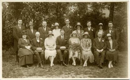 Keywords: Fred C Palmer Swindon Wedding Party 018.jpg Portrait photo of wedding party at Swindon Wiltshire England 1920s or 1930s The photographer was Fred C Palmer of Tower Studio Herne Bay Kent ca 1905-1916 and of 6 Cromwell Street Swindon ca 1920-1936 He died in 1941 ;Points of interest Palmer tended to concentrate on creating one fine individual portrait within a group portrait; not usually the central figure In this case he has perhaps unusually chosen the wedding couple who are shown with happy and moving expressions The groom wears a fine pair of spotted socks; at that time they would be hand-knitted by a family member or acquaintance and highly prized The seated women are wearing silk stockings Photographers would keep a dressing-up box which included socks ties and silk stockings for portraits such as this Border The remaining border of this image is important for researchers of this photographer Some photographers trimmed their images more than others and Palmer has a reputation for producing smaller postcards than other early 20th century UK photographers He took his own photos developed them in-house onto postcard-backed photographic paper and trimmed them himself It is worth adding that during hand-developing the border is actively masked with equipment which both crops the picture and causes the white frame or border to appear on the paper This frame is part of the design and is one of the reasons why the quality of Palmer's work is so interesting and why there is an article and category for him on English Wiki Researchers need to see exactly where the edge of the postcard is Thank you for taking the time to read this scanned from original postcard by uploader s 1920 or 1930s unpostmarked card Fred C Palmer died 1941 out of copyright PD-art-70 Fred C Palmer of Swindon People of Swindon History of Swindon Wedding portrait photographs Wedding ceremonies in the United Kingdom |