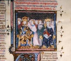 Keywords: Frederick2-SaintLouis.jpg en Coronation of Frederick II 1194-1250 and of Louis IX 1214-1270 from a Psalter by Pierre Lombard early 15th century de Krönung von Friedrich II 1194-1250 und von Ludwig IX 1214-1270 aus dem Psalter des Pierre Lombard frühes 15 Jahrhundert Psalter of Pierre Lombard Bibliothèque de la Sorbonne Paris www bridgemanart com century 15 Louis IX of France in miniature Frederick II Holy Roman Emperor PD-old |