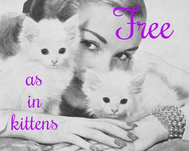 Keywords: freeasinkittens freesoftware woman kitten kittens free freedoms software gpl gnu opensource open openculture remixculture remix community communitysoftware We’re all familiar with free as in beer v. free as in speech, but perhaps “free as in kittens” more accurately captures the costs to organizations adopting some FLOSS projects for their own use. Freek Kittens Post We’re all familiar with free as in beer v. free as in speech, but perhaps “free as in kittens” more accurately captures the costs to organizations adopting some FLOSS projects for their own use. Freek Kittens Post |