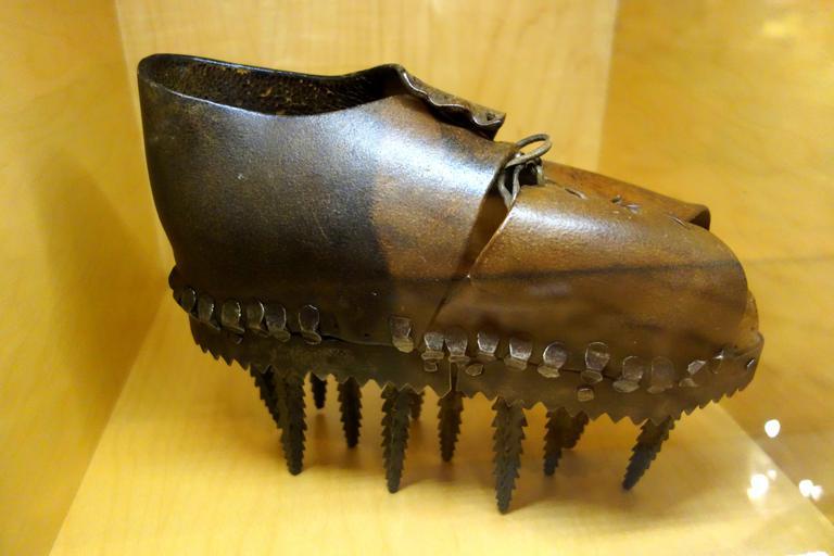 Keywords: French chestnut-crushing clog, Haute Ardeches, 1800-1900 - Bata Shoe Museum - DSC00226.JPG en Exhibit in the Bata Shoe Museum Toronto Ontario Canada The museum permitted photography without restriction 2013-07-04 10 37 28 own Daderot cc-zero Shoes in the Bata Shoe Museum Uploaded with UploadWizard Shoes of France Culture of Ardèche Chestnuts Iron shoes |