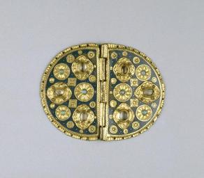 | Keywords: French - Clasp for a Secular Garment - Walters 4416.jpg During the Middle Ages copper mantle clasps with enameled decoration and gemstones were primarily made for church garments This clasp from France was sewn onto fabric using holes around the borders However this piece without figural representation and decorated with gemstones could have been worn with a secular garment late Other date century 13 Medieval gilded copper champlevé enamel gemstones cm 8 41 10 8 accession number 44 16 23964 Victor Gay Paris by purchase Collection of Victor Gay Sale Hôtel Drouot Paris March 23 1909 no 35 Henri Daguerre Paris by purchase Henry Walters city Baltimore Walters Art Museum Henry Walters Acquired by Henry Walters 1924 The Arts of Man Dallas Museum of Art Dallas 1962 Jewelry - Ancient to Modern The Walters Art Gallery Baltimore 1979-1980 Objects of Adornment Five Thousand Years of Jewelry from the Walters Art Gallery Baltimore Cooper-Hewitt National Design Museum New York; Chrysler Museum of Art Norfolk; Carnegie Museum of Art Pittsburgh; San Antonio Museum of Art San Antonio; Philbrook Museum of Art Tulsa; Honolulu Academy of Arts Honolulu; New Orleans Museum of Art New Orleans; Milwaukee Art Museum Milwaukee; Minneapolis Institute of Arts Minneapolis; Toledo Museum of Art Toledo; The John and Mable Ringling Museum of Art Sarasota 1984-1987 Jewelry from the Walters Art Museum and the Zucker Family Collection The Walters Art Gallery Baltimore 1987 Bedazzled 5 000 Years of Jewelry from the Walters Art Museum Frist Center for the Visual Arts Nashville; The John and Mable Ringling Museum of Art Sarasota; The Walters Art Museum Baltimore 2006-2009 Bedazzled 5 000 Years of Jewelry El Paso Museum of Art El Paso 2010 place of origin Limoges France Walters Art Museum license Medieval metalwork in the Walters Art Museum Jewellery in the Walters Art Museum Art of France in the Walters Art Museum Media contributed by the Walters Art Museum needs category review |