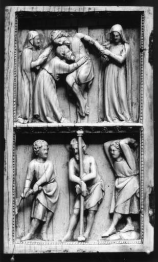 Keywords: French - Deposition and Flagellation - Walters 71122.jpg The upper scene is the Deposition from the Cross the lower one the Flagellation of Christ The scenes are placed below moldings with rosette decoration the sides and the lower border are roped The openness of the compositions and the relative scale of the figures give this small panel a monumental quality The panel belongs to the Rose Group and the scenes are rather comparale in treatment to though entirely different in detail from Walters 71 124 The Rose Group is complex while there is a general similarity in composition among the individual ivories there is a great variety of subjects and approaches It is questioned as well whether all the works in the group were made in the same area The insertion of a single element of landscape beneath the feet of one of Christ's tormentors in the Flagellation is unusual though landscape elements occur in Walters 71 124 and other Rose ivories No other examples have roped sides The panel has slight chipping at the hinges and the lower right corner 1st quarter 14th century Medieval ivory cm 11 6 6 9 accession number 71 122 12384 Léon Gruel Paris date and mode of acquisition unknown William T / Henry Walters Collection Baltimore date of acquisition unknown by purchase Walters Art Museum Henry Walters Acquired by William T or Henry Walters Transformations of the Court Style Gothic Art in Europe 1270-1330 Rhode Island School of Design Providence 1977 place of origin Paris France Walters Art Museum license Medieval ivory in the Walters Art Museum Art of France in the Walters Art Museum Media contributed by the Walters Art Museum needs category review |