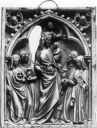 Keywords: French - Diptych Leaf with Virgin, Child, Saints and Angels - Walters 71248.jpg This left diptych leaf shows the Virgin Mary holding the Christ Child She is crowned by an angel Standing next to her are two angels and St Catherine on the left and St Clare on the right between 1340 1350 Medieval ivory with paint and gilding cm 13 4 10 5 accession number 71 248 26441 Edouard Aynard Lyons Edouard Aynard Sale Hotel Drouot Paris December 1 1913 no 177 Léon Gruel Paris Henry Walters city Baltimore Walters Art Museum Henry Walters Acquired by Henry Walters 1914 Les Fastes du Gothique le Siècle de Charles V Galeries nationales du Grand Palais Paris 1981-1982 God's Minstrel St Francis of Assisi The Walters Art Gallery Baltimore 1982 Bookish Business Henry Walters and Leon Gruel The Walters Art Gallery Baltimore 1993 place of origin Paris France Walters Art Museum license Medieval ivory in the Walters Art Museum Art of France in the Walters Art Museum Media contributed by the Walters Art Museum needs category review Sculptures of Madonna and Child Reliefs of Clare of Assisi |