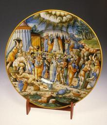 | Keywords: French - Ewer Basin with the Gathering of Manna - Walters 481374.jpg The demand for Italian maiolica spread to other European countries by the late 16th century and some Italian potters found it profitable to move their workshops to France The painting of this basin is awkward in comparison with others displayed here but it is interesting as possibly having been produced in Lyons an important city on the route between Italy and Paris The composition comes from a popular illustrated Bible printed in Lyons during the mid-16th century ca 1575 1600 Renaissance earthenware with tin glaze maiolica cm 7 3 43 6 accession number 48 1374 12873 H Wencke Collection Hamburg date and mode of acquisition unknown no 105 Henry Walters city Baltimore Walters Art Museum Henry Walters Acquired by Henry Walters 1908 text place of origin Lyons France Walters Art Museum license Italian Renaissance maiolica in the Walters Art Museum Art of France in the Walters Art Museum Media contributed by the Walters Art Museum needs category review |