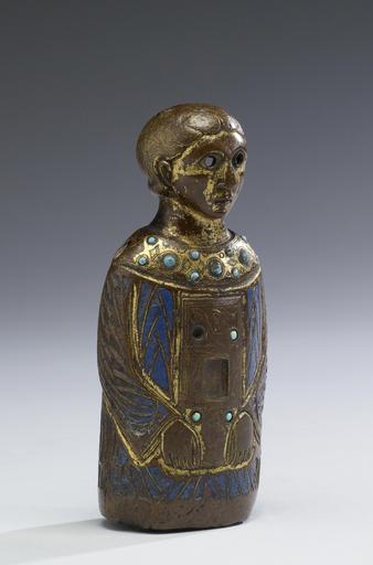 | Keywords: French - Figure of a Deacon - Walters 4418 - Three Quarter Right.jpg This relief figure resembles a statuette now in the church of Les Billanges western France Both figures hold a rectangular object upright against their chest that has been identified as a reliquary of the True Cross representing that sent to the nearby Abbey of Grandmont by King Amaury of Jerusalem r 1162-74 Like the French statuette this example was part of a monument that once graced the church of Grandmont perhaps a monumental cross or an altar frontal Grandmont was a religious foundation established by St Stephen of Muret ca 1044-1125 A number of enamels survive from the main church and its dependencies between 1230 1239 Medieval gilded copper repoussé engraved and chased champlevé enamel cm 13 5 5 accession number 44 18 3732 Henry Walters Baltimore date and mode of acquisition unknown Walters Art Museum Henry Walters Acquired by Henry Walters Reliquaries and Ritual Medieval Objects of Devotion The Walters Art Gallery Baltimore 1984-1985 Realms of Faith Medieval and Byzantine Art from the Walters Art Museum Frist Center for the Visual Arts Nashville 2001-2002 Realms of Faith Medieval and Byzantine Art from the Walters Art Museum Frist Center for the Visual Arts Nashville 2002-2005 place of origin Limoges France Walters Art Museum license Medieval metalwork in the Walters Art Museum Champlevé of Europe Art of France in the Walters Art Museum Media contributed by the Walters Art Museum needs category review |