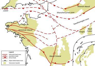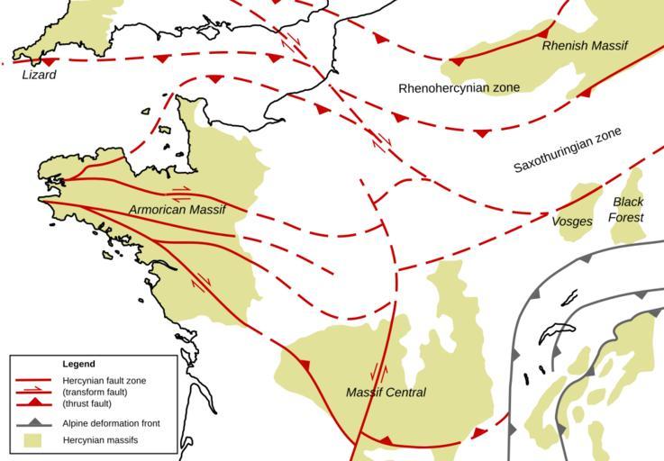 Keywords: French Hercynian massifs EN.svg Service Géologique National ; 1996 Carte géologique de la France au millionième Éditions BRGM 6<sup>th</sup> ed Paris Debelmas J ; 1974 Géologie de la France 1 vieux massifs et grands bassins sédimentaires Doin éditeurs Paris ISBN 2-7040-0011-5 Martínez-Catalán J R ; 1990 A non-cylindrical model for the northwest Iberian allochthonous terranes and their equivalents in the Hercynian belt of Western Europe Tectonophysics 179 pp 253-272 Matte Ph ; Maluski H ; Rajlich P Franke P ; 1990 Terrane boundaries in the Bohemian Massif Result of large-scale Variscan shearing Tectonophysics 177 pp 151-170 Pharaoh T C ; 1999 Palaeozoic terranes and their lithospheric boundaries within the Trans-European Suture Zone TESZ a review Tectonophysics 314 pp 17-41 own Woudloper 2008-11 Variscan orogeny Geological maps of the Netherlands Geological maps of Belgium Geological maps of France Geological maps of Germany SVG geology Structural geology maps SVG maps in English Geological maps of Switzerland Geological maps of England