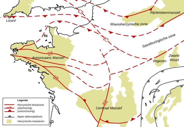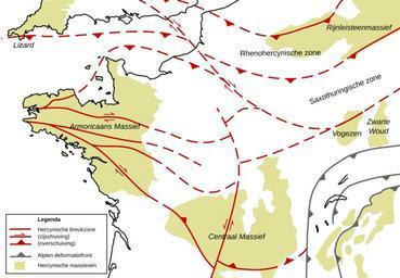 Keywords: French Hercynian massifs NL.svg Service Géologique National ; 1996 Carte géologique de la France au millionième Éditions BRGM 6<sup>e</sup> druk Paris Debelmas J ; 1974 Géologie de la France 1 vieux massifs et grands bassins sédimentaires Doin éditeurs Paris ISBN 2-7040-0011-5 Martínez-Catalán J R ; 1990 A non-cylindrical model for the northwest Iberian allochthonous terranes and their equivalents in the Hercynian belt of Western Europe Tectonophysics 179 pp 253-272 Matte Ph ; Maluski H ; Rajlich P Franke P ; 1990 Terrane boundaries in the Bohemian Massif Result of large-scale Variscan shearing Tectonophysics 177 pp 151-170 Pharaoh T C ; 1999 Palaeozoic terranes and their lithospheric boundaries within the Trans-European Suture Zone TESZ a review Tectonophysics 314 pp 17-41 own Woudloper date Variscan orogeny Geological maps of the Netherlands Geological maps of Belgium Geological maps of France Geological maps of Germany SVG geology Structural geology maps Maps in Dutch