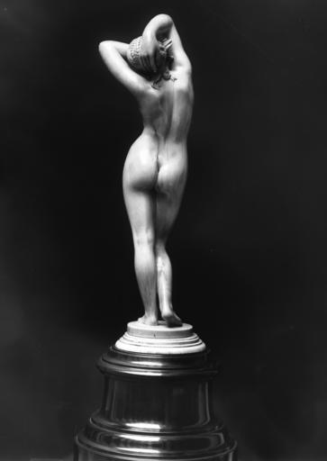 Keywords: French - Phyrne - Walters 71368 - Back.jpg Phyrne stands on an ivory socle mounted on a wooden base Her elaborately braided coiffure is bound with a ribbon and a strand of graduated pearls Turning her head she shields her face with her left forearm Phyrne ambiguously conteracts this gesture of modesty by raising her right arm over her head to display her voluptuous torso to best advantage In the 19th century the famous courtesan was popularized by Jean-Léon Gérôme's masterpiece of 1861 Phyrne before the Tribunal illustrating the titillating moment when the orator Hypereides won his client's acquittal by baring her bosom to the appreciative Athenian judges Having served as the model for Praxiteles and Apelles as well the subject of Phyrne offered artists an occasion for representing an idealized nude Gérôme's figure frequently served as the prototype for representations of Phrne in bronze ivory and silver The anonymous Walters ivory differs from Gèrôme's composition in the position of the figure's arms 2nd half Other date century 19 ivory cm 27 4 accession number 71 368 13264 William T / Henry Walters Collection Baltimore date of acquisition unknown by purchase Walters Art Museum Henry Walters Acquired by William T or Henry Walters The Spectacular Art of Jean-Léon Gérôme Museo Thyssen-Bornemisza Madrid; J Paul Getty Museum Los Angeles; Musee D'Orsay Paris 2010-2011 place of origin France Walters Art Museum license Art of France in the Walters Art Museum Media contributed by the Walters Art Museum needs category review Sculptures in the Walters Art Museum Braids in art |