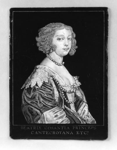 Keywords: French - Portrait of Béatrice de Cusance, Princess of Cantecroix - Walters 4443.jpg The half-length portrait represents the princess turned to the right her face in three-quarters view Her hair is cut with short locks at the sides and with a slight bang over the forehead She wears a decolleté blue and white dress trimmed with deep pointed white lace a necklace of pearls as well as a rope of pearls fastened to her collar on either side A thin line of gold frames the portrait which is probably based on a contemporary painting or an engraving after a painting Beatrice de Cusance daughter of Claude de Beauvoir married in 1635 the wealthy Eugène Léopold d'Oiselet Prince of Cantecroix ca 1660 Baroque painted enamel on copper with gilt gesso frame cm 20 8 16 5 accession number 44 43 35950 George Robinson Harding New York date and mode of acquisition unknown Henry Walters city Baltimore Walters Art Museum Henry Walters Acquired by Henry Walters 1918 The lower edge of the plaque is inscribed in gold BEATRIX COSANTIA PRINCEPS CANTECROYANA ETC place of origin Limoges France Walters Art Museum license 2D Baroque paintings in the Walters Art Museum Art of France in the Walters Art Museum Media contributed by the Walters Art Museum needs category review Portrait miniatures in the Walters Art Museum Béatrice de Cusance Princess of Cantecroix |