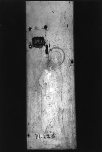 Keywords: French - Saints and Censing Angel - Walters 71126 - Reverse.jpg Two female saints one with a jar and book and the other with a bird and palm face to the left beneath a trefoil arch Above an angel kneels beneath a round arch and holds a censer and incense boat The panel has been broken and cut to conform with the arch at the top and has broken miters for hinges on the left side The right border has been narrowed There are traces of polychromy particularly in the surrounds of the lower arch The back of the panel shows signs of having had a clasp attached to it and there are remains of a standing bearded saint in polychrome The head of the saint is incised into the ivory Although the style of the carved figures on the front is broad with apron-style drapery that of the painted saint on the back is elegant and elongated normally datable to about 1250-1260 While it seems likely that the ivory was painted in a second and very conservative atelier the fact that the head of the saint is incised into the ivory suggests it was drawn by an ivory worker between 1330 1350 Medieval ivory traces of polychromy cm 16 8 4 5 accession number 71 126 7148 London 1862 exhibited a the South Kensington Museum no 161 John Watkins Brett London date of acquisition unknown by purchase J Brett Sale Christie's London April 18 1864 no 2008 Octave Homberg Paris date of acquisition unknown by purchase Octave Homberg Sale Hôtel Drouot Paris May 11 1908 no 484 Jacques Seligmann Paris date of acquisition unknown by purchase Henry Walters city Baltimore Walters Art Museum Henry Walters Acquired by Henry Walters 1912 place of origin Paris France Walters Art Museum license Medieval ivory in the Walters Art Museum Art of France in the Walters Art Museum Media contributed by the Walters Art Museum needs category review |