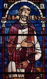 | Keywords: French - Stained Glass Window with an Apostle or Ancestor of Christ - Walters 4638.jpg This figure may be one of a group of twelve ancestors of Christ from the abbey church of Saint-Yved in Braine near Paris The figure bears the name of the apostle Thaddeus but since only three letters are original the H A and E the name may in fact be Phaleg or Phares Old Testament figures from the genealogy connecting Christ to Adam Parts of the window especially the bottom panel are modern restorations Panels from this series have been connected in style and composition to the stained glass of Canterbury cathedral illustrating the artistic ties between France and England during this period ca 1200 Medieval paint on stained glass cm 177 2 76 8 accession number 46 38 24206 Raoul Heilbronner Paris Henry Walters city Baltimore Walters Art Museum Henry Walters Acquired by Henry Walters 1910 Original letters in medieval glass H A E; Modern restoration reads THA/DEUS place of origin France Walters Art Museum license Medieval art in the Walters Art Museum Medieval art of France Media contributed by the Walters Art Museum needs category review 12th-century stained glass windows in France |