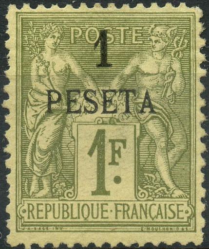 | Keywords: FRENCHMOROCCO0007.jpg en France Postal Agency In Morocco 1891 1 franc surcharged 1 peseta 1891 Scan from my personal collection stamp released by French Post Office in Morocco in 1891 Jules Auguste Sage 1840 ”1910 designer other versions PD-old-70-1923 Stamps of French Post in Morocco |