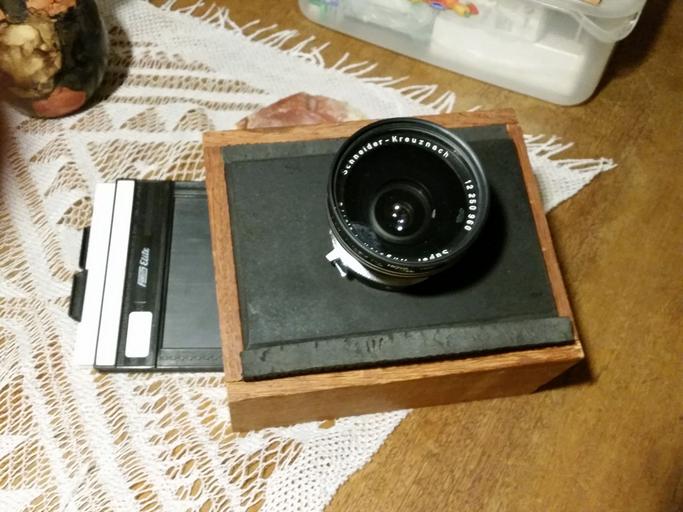 Keywords: caixa de MDF com a lente corre dentro da moldura de angelim, calços justos de EVA 1cm, dá para correr para ajustar o foco; câmera feita para trabalhar na hipefocal