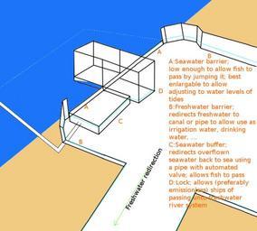 | Keywords: Freshwater river redirection.png en A schematic showing how a river can be redirected so that the water may be used for drinking water irrigation The schematic was made based on a plan to divert the murray river inland and break the connection with the sea It was reported that besides giving a supply of already fairly pure freshwater other benefits exist too such as the halting of the salination of rivers In addition it might allow to control pollution of the river as it becomes a greater asset to villagers and also implement additional pollution control regarding pollution from ships Note a second seawater buffer box should have actually been placed after the lock aswell but this was not done in order to increase clarity of the system own KVDP 2009-11-04 technology When a rediversion of a river such as described here is done it may also be useful to change the marking buoy system At present the IALA-A system for example adheres to a different color pattern than what is usual red for left side green for right when facing the river mouth It may be advisable to change navigation lights and markings to red for right green for left and extent this troughout the entire system and make sure the red buoys are placed on the right side and the green buoys are placed on the left side when facing the river coming from the sea Ichthyology Hydraulics Marine engineering Hydropower schemas and diagrams |