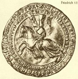 | Keywords: FridrichSlicny.jpg This is a scan of the historical document Title Die Siegel der deutschen Kaiser und Könige v 1 751 - 1347 scan from original book 1909 Otto Posse 1847-1921 Out of copyright as author died more than 70 years ago http //upload wikimedia org/wikipedia/commons/9/9f/Posse_Band_1_0087 jpg PD-old Frederick I of Austria Habsburg Medieval seals Posse Die Siegel der deutschen Kaiser und Könige v 1 Equestrian seals | ||||