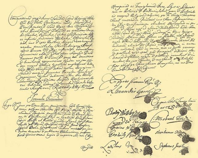 Keywords: Friede von Sathmar 1711 01.jpg de Originalurkunde des Friedens von Sathmar unterzeichnet am 1 Mai 1711 http //mek oszk hu/00800/00893/html/doc/c400450 htm v11 Österreichisches Staatsarchiv 1711-05-01 Clementissima m itaq ue hanc Sac ra tiss im ae Caesar eae Regiaeq ue M ies t a tis d omi ni d omi ni nostri clementissimi medio praescriptor um plenipotentiarior um suor um regno huic Hung a riae parti- bus principatuiq ue Tran silva niae ac eorundem vniver- sis statibus ordinibus civibus superioris item aeqve ac inferioris conditionis militibus nationibus in- colis imo e t ipsis rusticis benigne resolutam ge- neralem amnistialem gratia m benignaq ue pacifi- ca ti onis puncta nos qvoq ue infrascripti nomine totius communitatis absente adhuc etiam suprafato duce hactenus nostro e t principe omni cum demissione e t humilitate recognoscentes eandem uti jam pri dem magno desiderio expectata m amplectimur eidemq ue Suae M aies t a tis Sac ra tiss i mae debitu m nostrum homagium secundu m annexam iuramenti formulam humilime deponimus nihil dubitantes qvin Sua M aies ttas sic Sacratissima qvoq ue p rae missas benignas resolutiones sit rati habitura iisdemq ue in omnibus clausulis e t ar- ticulis Satisfactura; Kárólly Maji A nn i 1711 Formula iuramenti Ego N juro per Deum vivum omnipotentem coeli terraeq ue crea- torem Postqvam Sacratiss im a Caes a r ea Regiaq ue Maj e stas ex super abundanti clementia amnistialem vitae e t bonor um grati- am vi plenipotentiae il lustrissi mo ac excell en tiss im o d omi no Iohanni Comiti Palffi ab Erdöd ejusdem generali CampiMars- challo per regnu m Hung a riae supremo armor um praefecto Croatiae bano cataphractor um tribuno concessae per jam dudum emanatas e t publicatas declarationes propter hosce p rae teritos motus largita e t impertita sit nec n o n regni Hungariae ac Transylvaniae iura leges et libertates tam in politicis e t provincialibus qvam e t ecclesiasti cis receptar um religionu m negotiis per se suosq ue successores sancte conservanda promiserit imo suam confirmationa- lem qvoq ue ratificationem obtulerit me proinde in po- sterum e t semper usq ue ad ultimu m vitae spiritu m eidem Sacra- tiss im ae Caesar eae Regiaeq ue Ma ies t a ti ejusdemq ue in regno legitimo successori futurum fore fidum ac fidelem nec qvidqva m contra debitu m homagialis vinculi obligamen directe vel indirecte alieno vel proprio motu e t conatu in contra- rium com m issur um sed ea omnia rite ac probe acturum e t praestitur um re e t opere qvae homagiali devotioni obe- dientiae e t servitio agenda et prae- standa incumbunt e t in- cumbent ita juro spondeo e t me sancte et inviolabili fide obligo per sacrosancta Evangelia uti me Deus trinus e t vnus qvoq ue adjuvet Ex parte statuum r e gni U n g ariae Alexander Karolyi m p P H Pereny Miklos m p Ex parte Statuu m Tran silvan iae domini P H Caspar us de Reva m p P H Bartzaj Mihal P H Emericus de Re va m p P H C omes Michael Teleki P H Emeric us Szent Péter i P H Abrahamus Barcsai P H Ladislaus Vay P H Stephanus Josika m p P H PD-old-100 Peace treaties Sándor Károlyi 1669-1743 Documents of the Rákóczi's War for Independence 1711 in military history Manuscripts Signatures of people from Hungary Documents in Latin |