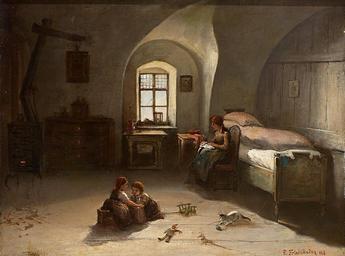 Keywords: Friedrich Friedländer (attr) Blick in eine Stube.jpg Blick in eine Stube mit spielenden Kindern und Mutter bei der Handarbeit oil on canvas 31 5 x 40 cm http //www zeller de Auktionshaus Zeller by 1901 Friedrich Friedländer 1825 “1901 PD-old-100 Images from Auktionshaus Zeller Friedrich Friedländer People in rooms in art Playing children in art Heating stoves |