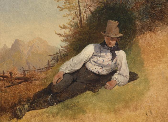 Keywords: Friedrich Gauermann Bauernbursche 1830er.jpg Bauernbursche auf einer Wiese liegend oil paper canvas 20 9 x 27 cm http //www dorotheum com Dorotheum end other date s 1830 Creator Friedrich Gauermann PD-old-100 Images from Dorotheum Friedrich Gauermann 1830s paintings Paintings of recumbent men outdoors |