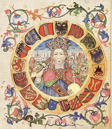 Keywords: Friedrich III. (Greiner Marktbuch).jpg Friedrich III Miniatur im Greiner Marktbuch Scan aus Rudolf Lehr “ Landeschronik Oberösterreich Wien Verlag Christian Brandstätter 2004 S 103 ISBN 3-85498-331-X author ~ 1490 PD-old-100 Frederick III Holy Roman Emperor 15th-century illuminated manuscripts History of Grein Males with swords in art Medieval miniatures of historical persons Illuminated archival materials Historical coats of arms of Austria Coats of arms of Austria to be classified Coats of arms in medieval miniature |