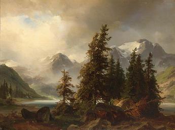 Keywords: Friedrich Preller d.Ä. - Blick auf eine alpine Landschaft.jpg Artwork Creator Friedrich Preller der Ältere probably s 1840 oil on canvas cm 33 43 accession number object history Private collection Hannover credit line Preller lower left signature http //www sothebys com/en/auctions/ecatalogue/2007/an-important-private-collection-from-hanover-am1020/lot 244 html Sotheby's Amsterdam 27-29 March 2007 lot 244 <gallery>File Preller Norwegian landscape jpg langSwitch Ein ähnliches Motiv mit norwegischer Landschaft von Preller d Ä im Nationalmuseum in Warschau a similar painting by Preller I in the National Museum Warsaw </gallery> PD-old-100-1923 1878 Friedrich Preller der Ältere Paintings of the Alps 19th-century mountain paintings 1840s landscape paintings Images from Sotheby's |