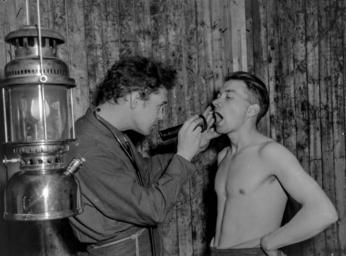 Keywords: andre verdenskrig andreverdenskrig vårslipp 2015 vårslipp2015 frigjøring 2. verdenskrig 2verdenskrig kirkenes finnmark norge blackandwhite monochrome black and white Original bildetekst: Allerede de første dagene etter befrielsen av Kirkenes meldte omlag 1.500 nordmenn seg som frivillige til de norske styrkene. Under ledelse av norske offiserer tok de straks opp trening og vaktarbeide i de befriede områder. Bildet er tatt under legeundersøkelsen, som foregår i en forhenværende tysk brakke under ytterst primitive forhold. En stor petroleumslampe er den eneste lyskilde, trengs mer må lommeløkta tas i bruk. Fotograf: Ole Friele Backer Arkivreferanse: NTBs krigsarkiv i Riksarkivet (RA/PA-1209/U/Uj/L0214) Original bildetekst: Allerede de første dagene etter befrielsen av Kirkenes meldte omlag 1.500 nordmenn seg som frivillige til de norske styrkene. Under ledelse av norske offiserer tok de straks opp trening og vaktarbeide i de befriede områder. Bildet er tatt under legeundersøkelsen, som foregår i en forhenværende tysk brakke under ytterst primitive forhold. En stor petroleumslampe er den eneste lyskilde, trengs mer må lommeløkta tas i bruk. Fotograf: Ole Friele Backer Arkivreferanse: NTBs krigsarkiv i Riksarkivet (RA/PA-1209/U/Uj/L0214) |
