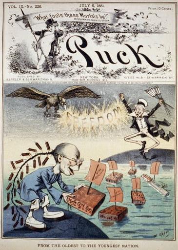 Keywords: From the Oldest to the Youngest Nation.jpg <small>TITLE From the oldest to the youngest nation CALL NUMBER Illus in AP101 P7 1881 Case X P P REPRODUCTION NUMBER LC-USZC2-1247 color film copy slide RIGHTS INFORMATION No known restrictions on publication SUMMARY Caricature showing Chinese man with firecrackers in his queue floating firecrackers to Uncle Sam who is jumping in joy MEDIUM 1 print lithograph color CREATED/PUBLISHED 1881 NOTES Color lithograph by Frederick Burr Opper Illus in Puck 1881 July 6 cover p 301 Ref copy may be in SSF Gr - FOREIGN RELATIONS--CHINA-U S This record contains unverified old data from caption card REPOSITORY Library of Congress Prints and Photographs Division Washington D C 20540 USA DIGITAL ID color film copy slide cph 3b49147 http //hdl loc gov/loc pnp/cph 3b49147 CONTROL 2002720436</small> LOC-image cph 3b49147 1881-07-06 Creator Frederick Burr Opper PD PD-old-70-1923 Frederick Burr Opper Puck magazine 1881 magazines 1881 cartoons Uncle Sam Sino-American relations in cartoons |