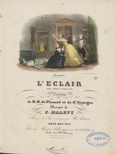 Keywords: Fromental Halévy, L'Éclair score cover.jpg Fromental Halévy's L'éclair This is possibly the first edition the opera premièred on 16 December 1835 1836 http //pds lib harvard edu/pds/view/46468045 n 9 printThumbnails no Harvard Library From Halévy F 1799-1862 Éclair Vocal score L'eclair opéra comique en trois actes / paroles de M M de Planard et de St Georges ; musique de F Halévy ; partition de piano arrangée par H Potier Paris M Schlesinger 1836 Mus 693 4 610 3 Paul Gavarni 1804 “1866 ;<ref>Compare the mirror-flipped signature at https //archive org/stream/gavarnig00gava page/48/mode/2up and consider also File Paul_Gavarni_-_The_Barmaid_-_Walters_371442 jpg and File Paul_Gavarni_-_Gulliver_and_the_Brobdingnagian_Philosophers_-_Walters_371482 jpg and File Paul Gavarni - Lady on Sofa - Walters 371427 jpg Add in that this was then lithographically reproduced and that Gavarni did a lot of work in title pages and worked for the Thierry brothers </ref> lithograph by the Thierry brothers other versions File Fromental Halévy L'Éclair score cover - Restoration jpg - Restoration JPEG File Fromental Halévy L'Éclair score cover - Restoration png - Restoration PNG File Fromental Halévy L'Éclair score cover jpg - Original JPEG Even if the attribution to Gavarni is wrong this is almost 180 years old; quite simply no-one could have lived long enough for it to be an issue PD-old-70-1923 Uploaded with UploadWizard Jacques Fromental Halévy Thierry frères Uploads by Chris Woodrich |