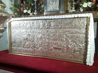 | Keywords: Frontal de prata do altar do Santíssimo Sacramento com iconografia eucarística do século XVIII, Tesouro da Sé de Angra do Heroísmo. Dimensões 140x90 cm..jpg en Front panel of the main alter 140 x 90 cm with eucharistic iconography from the 18th century Sé Cathedral Sé Angra do Heroísmo Terceira Azores Portugal pt Frontal de prata do altar do Santíssimo Sacramento com iconografia eucarística do século XVIII Tesouro da Sé de Angra do Heroísmo dimensões 140x90 cm Own 10/12/2008 José Luís Ávila Silveira/Pedro Noronha e Costa Arquivo pessoal Sé Catedral de Angra do Heroísmo |