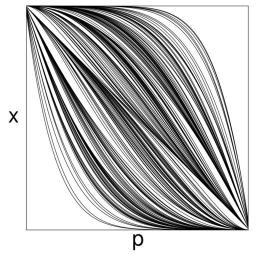 Keywords: Fubini Nightmare foliation Katok example.svg en Fubini Nighmare foliation example due to Katok Own Actually I've used C++-program to produce Asymptote source See ru ÐšÐ¾ÑˆÐ¼Ð°Ñ Ð¤ÑƒÐ±Ð¸Ð½Ð¸ Russian for details on the algorithm I hereby release the following source code into the public domain You have to do the following in order to produce an svg file assuming the file above is saved as 'fubini C' g++ fubini C -o fubini /fubini > fubini asy prepare a cup of coffee here it's a long calculations with default options asy fubini asy pstoedit fubini eps fubini svg Ilya Voyager 2009-07-03 Other fields Asymptote + C include <iostream> include <math h> include <vector> include <time h> include <stdlib h> include <assert h> using namespace std; double F double p vector<int> a int N assert p>0 p<1 ; int i; double x 0; double q 1-p; for i 0;i<N;i++ if ai 1 x+ q; q p; else q 1-p ; return x; main srand time NULL ; vector<int> a; double prec 2E-3; int N int 1/ prec prec ; int exp 500; int i j; double p; bool first true; cout << import graph;\nimport math;\nimport fontsize;\nunitsize 7inch ;\ndefaultpen 0 45mm ;\n << endl; for i 0;i<exp;i++ a clear ; for j 0;j<N;j++ a push_back rand 2 ; first true; for p 2 prec;p<1-2 prec;p+ prec if first cout << draw ; first false; else cout << -- ; cout << << p << << F p a N << ; cout << ; << endl; cout << xaxis \ p \ BottomTop fontsize 48 ;\nyaxis \ x \ LeftRight fontsize 48 ; << endl; CC0 Dynamical systems Images with C++ source code Guido Fubini |