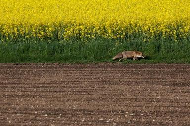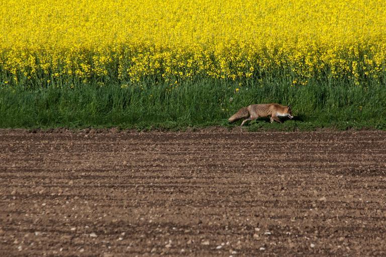 Keywords: fuchs red fox vulpes vulpes reddish brown wild animal predator fauna arable field of rapeseeds wild nature animals smart