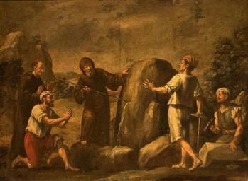 Keywords: Fuente milagrosa en el convento de Paula (Museo de Bellas Artes de Sevilla).JPG En esta obra es representado el milagro que según la tradición realizó San Francisco de Paula durante la construcción del convento de la ciudad italiana de Paula ya que cuadno los obreros se mostraron contrariados por la imposibilidad de beber agua en las cercanías del lugar San Francisco de Paula «punzó» con su báculo una piedra que se hallaba al pie de un monte e inmediatamente brotó una fuente de agua circa 1700 1710 oil canvas Size cm 109 85 Institution Museo de Bellas Artes Seville http //ceres mcu es/pages/Main object history Esta obra procede del desaparecido convento de San Francisco de Paula de Sevilla España que fue desamortizado y demolido en el siglo XIX exhibition history credit line accession number CE0932P http //ceres mcu es/pages/Main PD-old-100 Paintings of Saint Francis of Paola in Spain Paintings by Lucas Valdés in the Fine Arts Museum of Seville 18th-century paintings in the Fine Arts Museum of Seville |