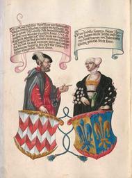 Keywords: Fugger Ehrenbuch 060.jpg Geheimes Ehrenbuch der Fugger hergestellt in der Werkstatt Jörg Breu d J 1545 “1549<br /> Portrait- und Wappendarstellung Hans Marx von Bubenhofen Sibilla Fuggerin Fugger von der Lilie http //daten digitale-sammlungen de/~db/0004/bsb00042105/images/ 1545 “1549 workshop PD-old-100 Geheimes Ehrenbuch der Fugger Portraits in Geheimes Ehrenbuch der Fugger Coats of arms in Geheimes Ehrenbuch der Fugger Coats of arms of Fugger von der Lilie family Coats of arms of Bubenhofen family |